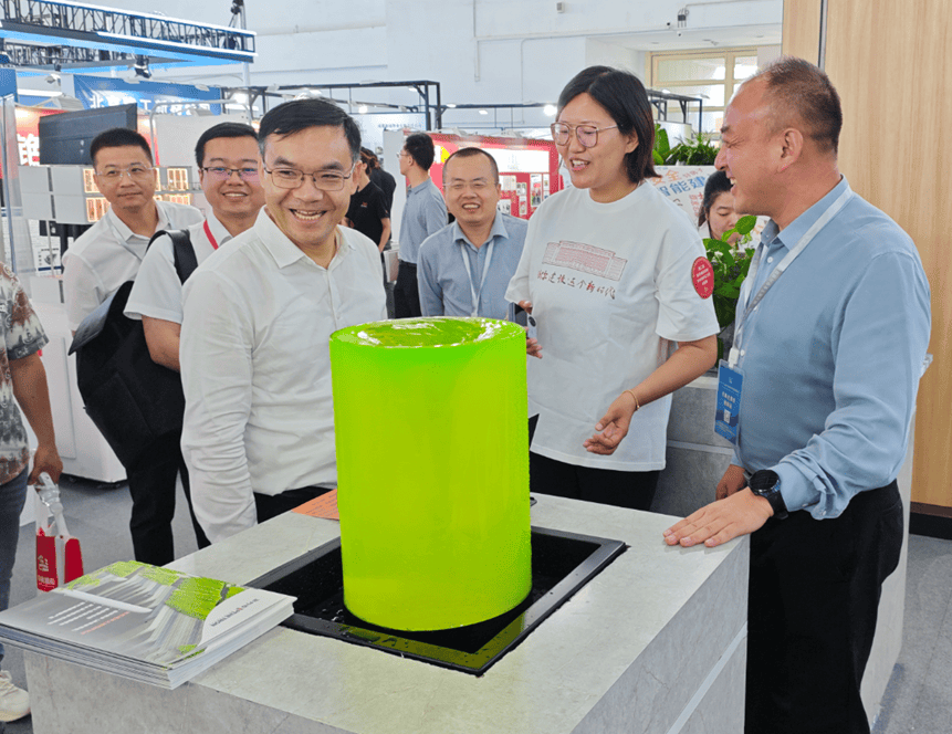 姜萬榮副部長參觀澎內傳展臺,邊聽講解、邊認真觀看水池池壁裂縫自愈合實際應用效果。
